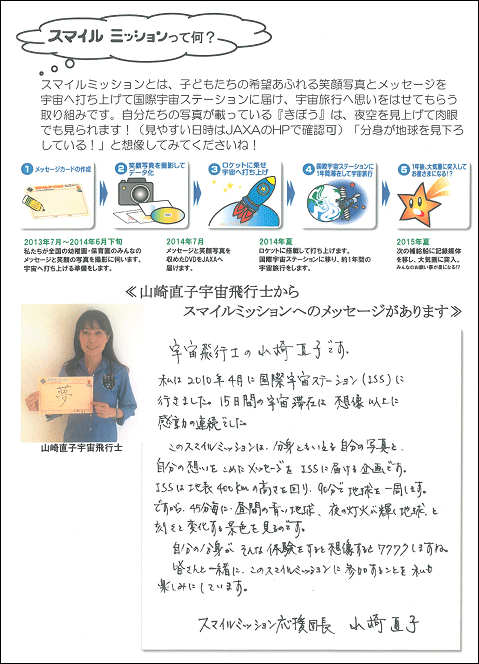 その1:「スマイルミッション」では、日本全国の幼稚園・保育園の園児の写真が打ち上げられることになっています。またこのミッションでは、山崎宇宙飛行士に「スマイルミッション応援団長」となっていただいています。現在、希望参加園を募集していますので、ぜひともご連絡ください。